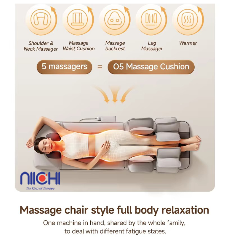 6. The mat integrates five functions: neck & shoulder massage, waist massage, back massage, leg massage, and heat therapy. With just one compact product, you can enjoy a complete relaxation experience equivalent to a premium full-body massage chair, making it perfect for every family member.